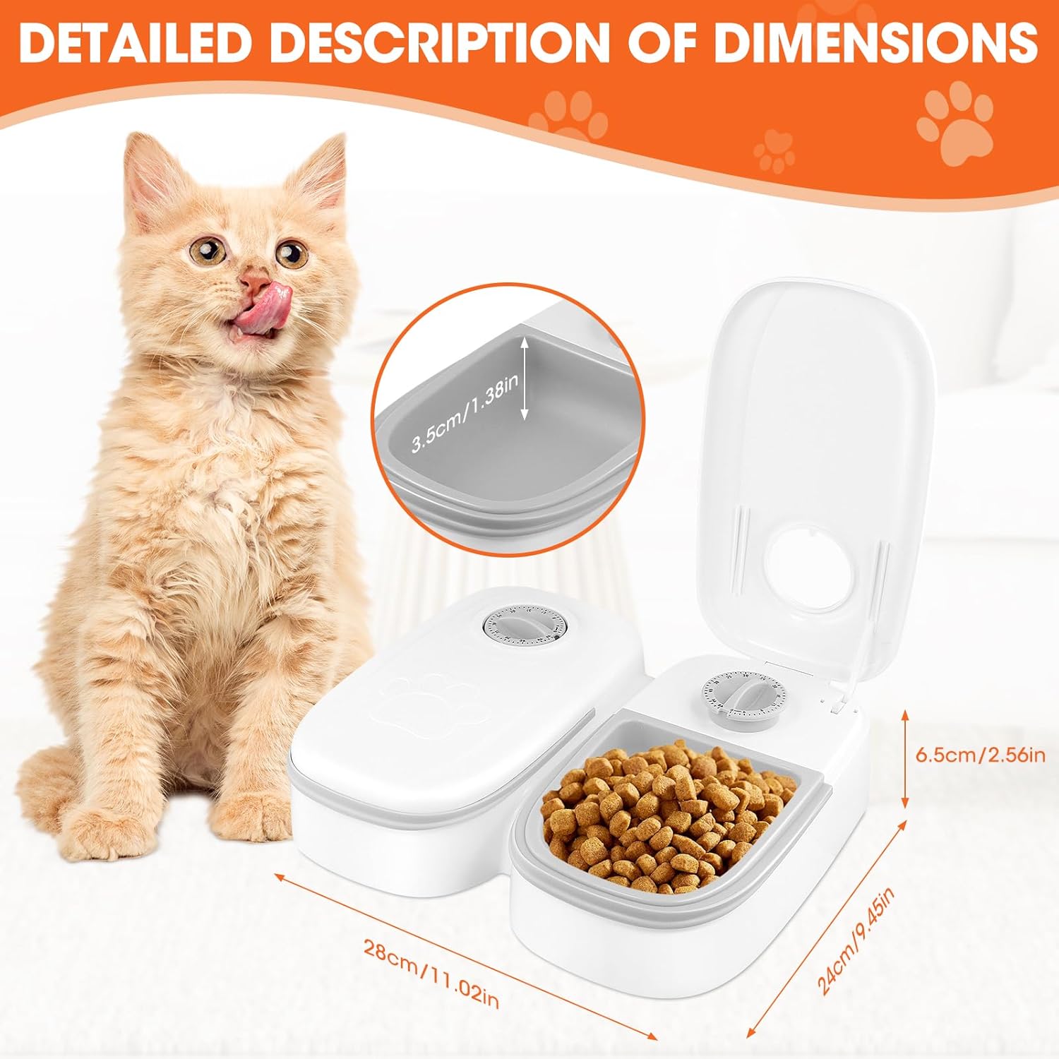【Compact and Space-saving】: Measuring 27*24*7cm, our Automatic 2 Meal Cat Feeder is compact and can fit anywhere in your home. Whether it’s placed in the kitchen, living room, or bedroom, it won’t take up too much space.