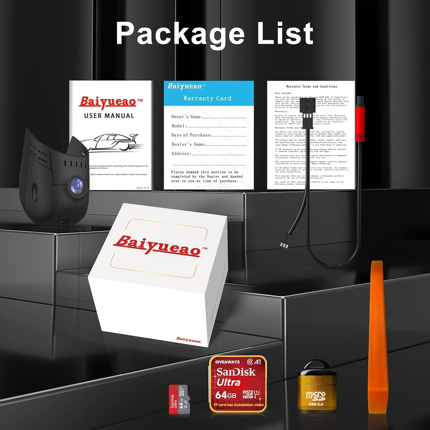 Baiyueao 4K 3840*2160 Cam for Audi A1 A3 A4 A5 A6 A7 A8 Q2 Q3 Q5 Q7 Q8 S3 S5 S7(2019-2025) WiFi Car Camera,with64GBcard,Loop Recording,24HParking Monitoring mode,Smart App Control, with Gravity-sensor