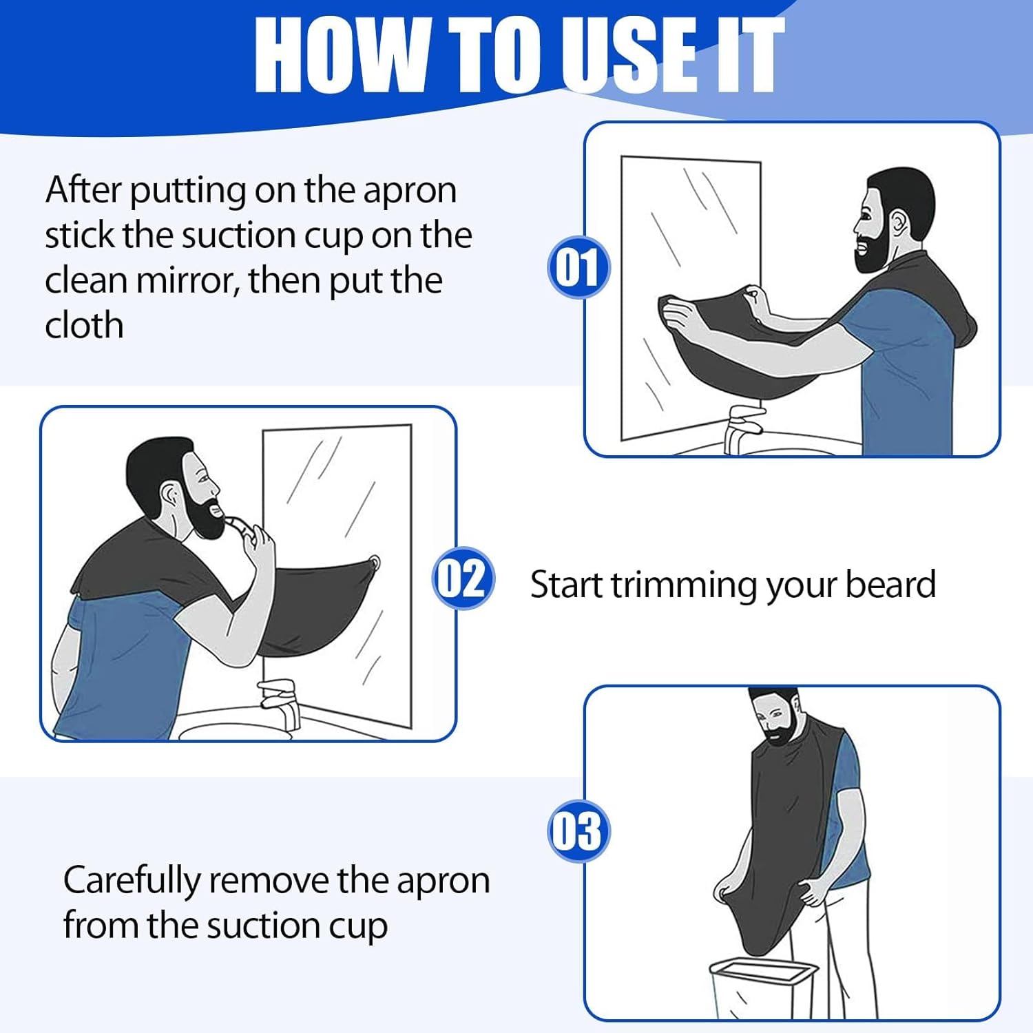 Easy to Use: This moustache grooming cape for shaving is a must-have for any man. By sticking the strong suction cups to mirror, The apron facilitates a hassle-free grooming process by allowing you to collect and dispose of hair trimmings directly into the trash – no more clogged sinks or hair scattered around your bathroom.