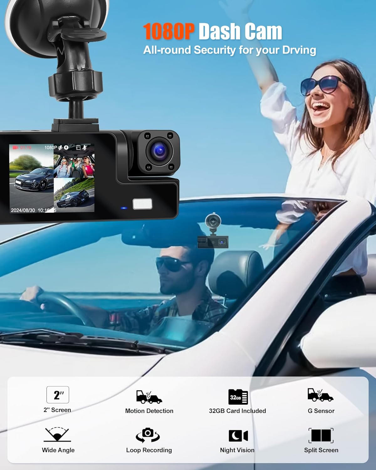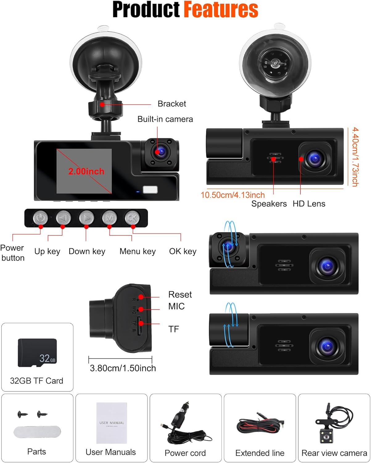 ►2 Inch 1080P HD monitor with triple dash cameras►HD Front camera with super night vision and 150°wide angle►Cabin inside camera with 4 IR Light to capture the driver and passengers►4-LED backup camera with night vision, guide lines and IP68 waterproof►3 channel videos for front/interior/rear view at the same time►Loop recording with 32GB TF card, saving evidence to protect your right►Support exposure compensation, gravity sensor, motion detection functions►Easy installation, just plug and play►Wide compatibility, such as cars, trucks, RVs, trailers, motorcycle, Jeeps, vans, SUVs, etc.