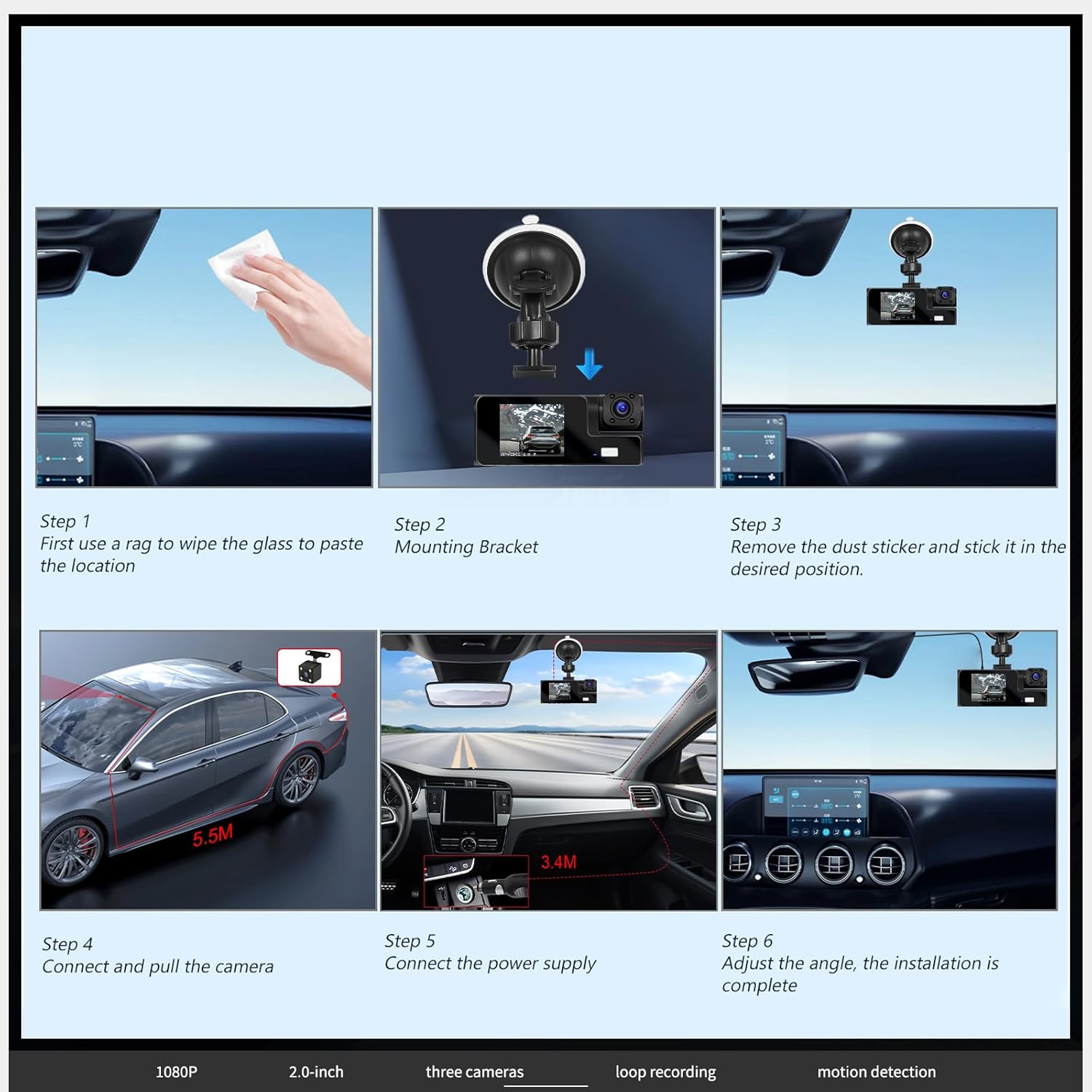 Screen (display) size 2.0-inch display Camera sensor Front 1080P + Built-in 480p + Rear 480p Front video resolution 1080P Video format AVI Photo format M-JPG Frames per second 30 Built-in stereo Support Viewing angle Front 150 degrees, Interior Rear 120 degrees Special features Three cameras, exposure compensation, motion detection, loop recording Time synchronization Support Memory card TF TF (maximum 64GB) Current frequency 50Hz/60Hz Installation type For all vehicles OSD Language English, Simplified Chinese, Traditional Chinese, Japanese, Korean, French, German, Spanish, Portuguese, Polish, Dutch, Turkish, Thai Note Please test the TF card for recording firstly, please reach us freely for any needs.