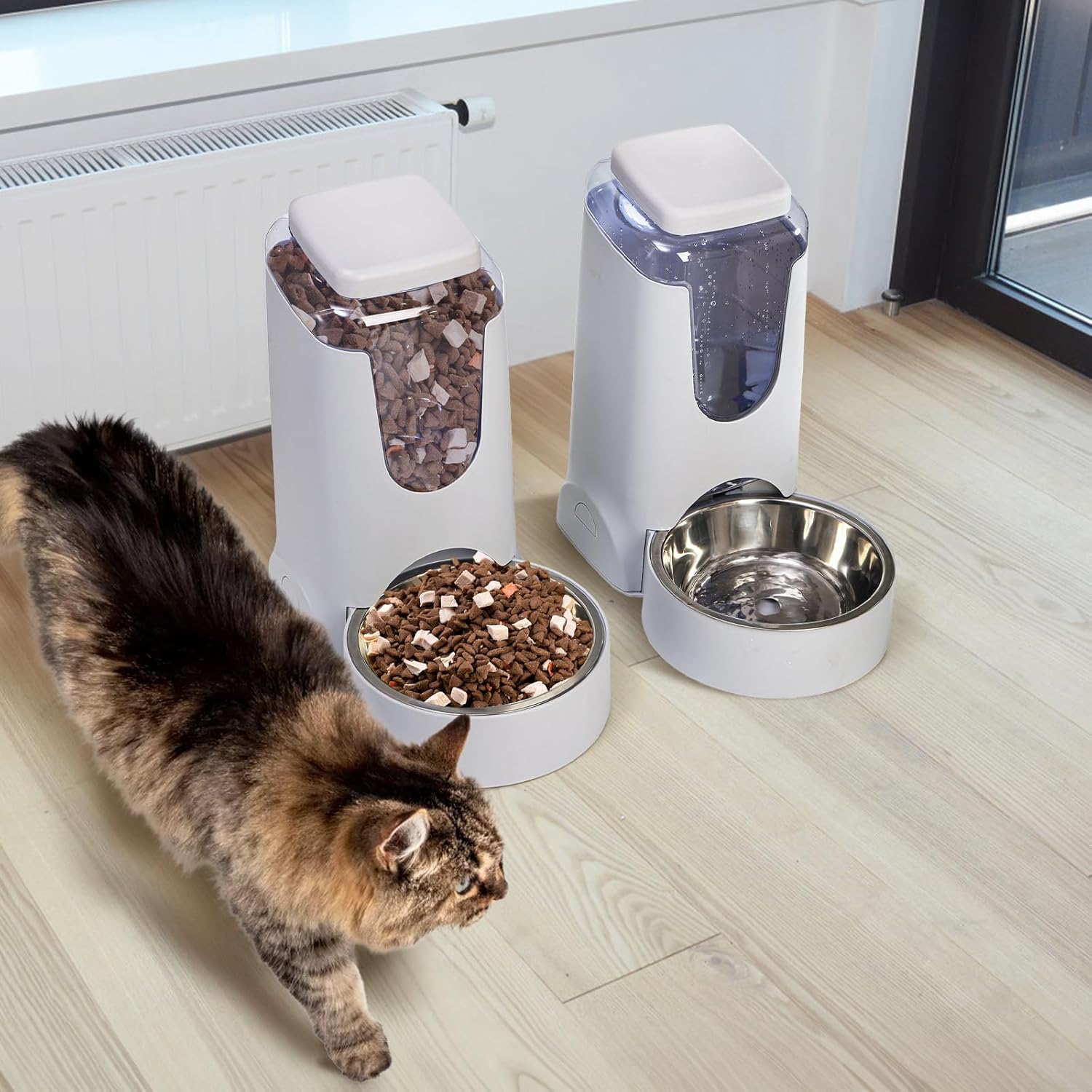 Package: automatic cat feeder with bowl *1, self water dispenser with bowl* 1. Capacity: 1 Gallon/4L Design: This automatic cat feeder and waterer set is designed with gravity supply system, which means the fresh water and dry food will automatically fill the bowl. Don’t worry that pets will be hungry when you are on vacation, work or party.