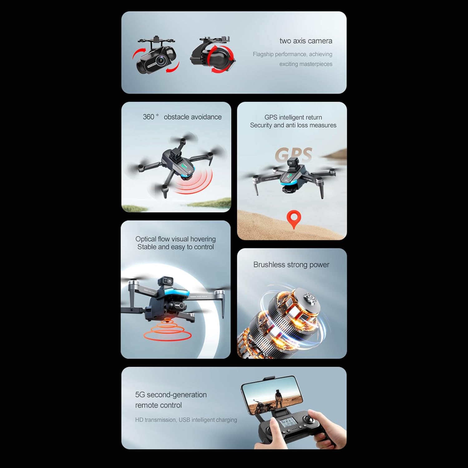 Two-axis gimbal with EIS stabilization: Achieve smooth and steady footage even in windy conditions or fast movements, thanks to the electronic image stabilization technology. GPS return home ensure your quadcopter returns safely to its takeoff point