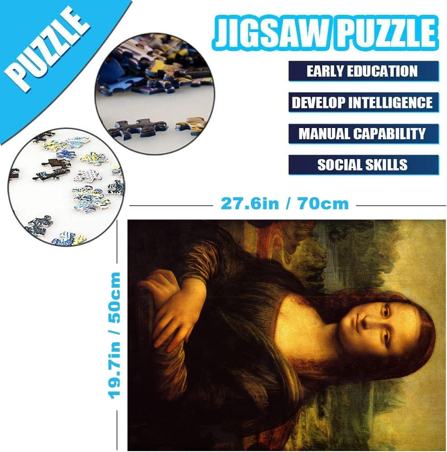 27.56 x 19.69 Inch Finished Size: The Mona Lisa Da Vinci puzzle manufactured by advanced premium printing technology. Each puzzle piece is cut in a unique shape to provide an extra level of self check and concentration, can effectively inspire people’s thinking, train their thinking, judgment and patience.
