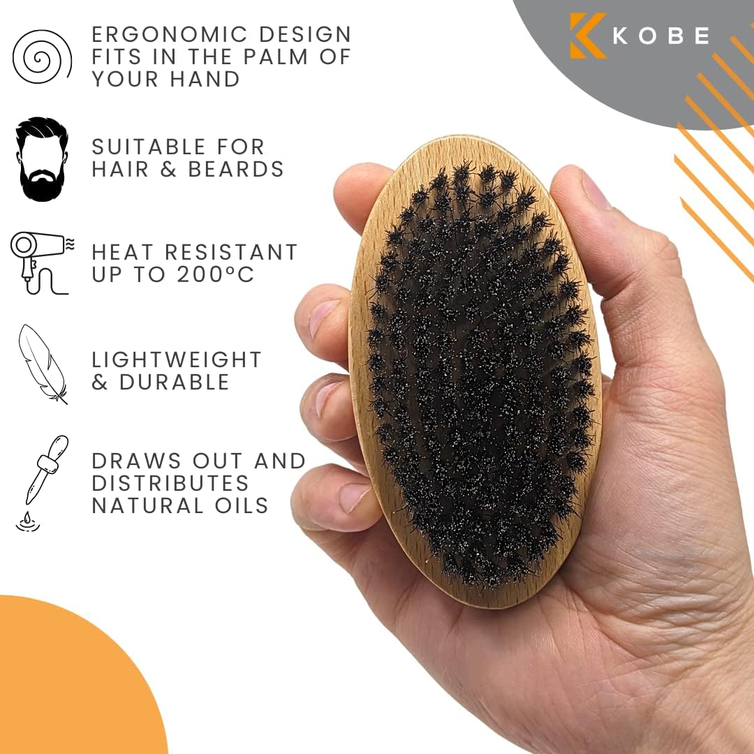 Kobe Palm Men’s Military Style Boar Bristle Hair Brush/Beard Brush – Hand Sized Beard Brush for Men – Perfect for Beard Care – Works Well With Beard Oils (Beech)