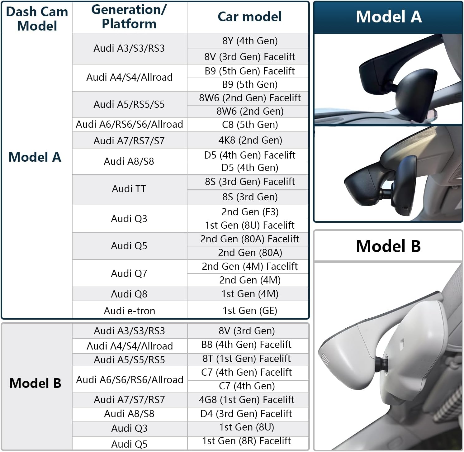 I purchased the Mangoal model A front and rear dash cam for my 2024 Audi Q8 e-tron in Nov. 2024. I installed it in less than an hour and it has performed flawlessly so far.I was hesitant to buy this cam because there werenât many reviews, and it was fairly new to the market. I took a chance, and I am not disappointed.What sold me is it looks like a factory installed option and no one knows you have a dash cam. I didnât want a clunky cam hanging from my windshield.The video quality is much better than I expected and acceptable.Overall installation was not hard, but getting the plastic trim pieces to clip together takes some effort. Once you figure out how they clip together, and realize you can use force without breaking anything, the pieces go together.The app works well, and I like the ease of being able to remove the SD card to download video onto my computer.You cannot view videos via the internet using the app away from the car. The app only works via wi-fi when inside the car to access settings or view and download videos.Iâve heard people complain about sounds coming from the cam when the vehicle is started. This is not an issue because you can use the app settings to turn off all sounds which is my preference.I have not had any issues with the cam interfering with the Audi rain sensor in the mirror or any other issues.Some people have voiced concerns the cam does not turn off when they leave the car. The cam will stay on for a short while and then the blue power lights will go out when it powers down.I have also read where some people claim the cam gets very hot. I have not experienced this issue.Overall, I am very happy with the Mangoal dash cam.