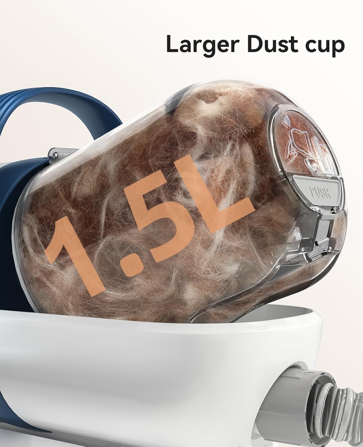 1.5L Large Dust Cup& Easy to Store: oneisall pet grooming kit with a detachable 1.5 L dust box, 50% more capacity than others,easy-to-empty, no need to empty often during grooming. The removable dust cup is equipped with an easy empty lid for quick, mess-free empty after cleaning.The device is highlighted with space-saving feature, we provide storage boards and bags for easy storage